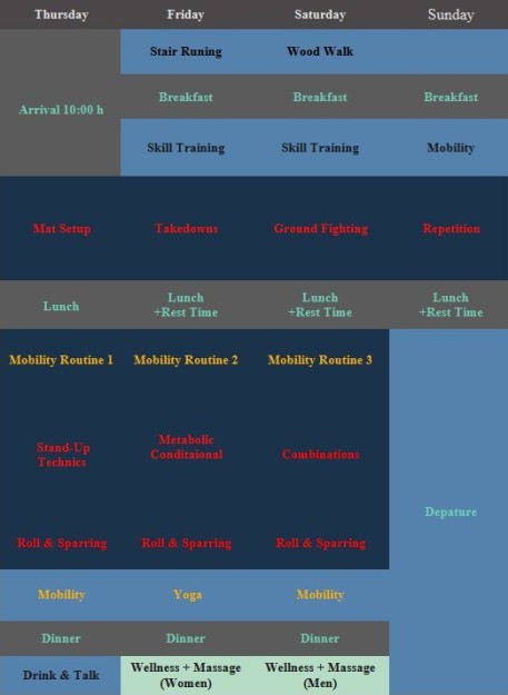Das Trainings Camp 2018 packte das Thema Distanzbearbeitung und den Übergang vom Stand in die Bodenlage an. Es wurden intensiv Techniken aus dem Clinch oder im direkten In-Fight bearbeitet. Eine gute Vorbereitung im Stand- Up Fight, über die Nahdistanz und in die Kontrolle im Boden mit anschließenden Submissions, brachten die Teilnehmer drei Tage wieder ins Schwitzen. Bei gutem Essen und Wellness am zweiten Tag blieben keine Wünsche offen. Danke für die tolle Zeit.
